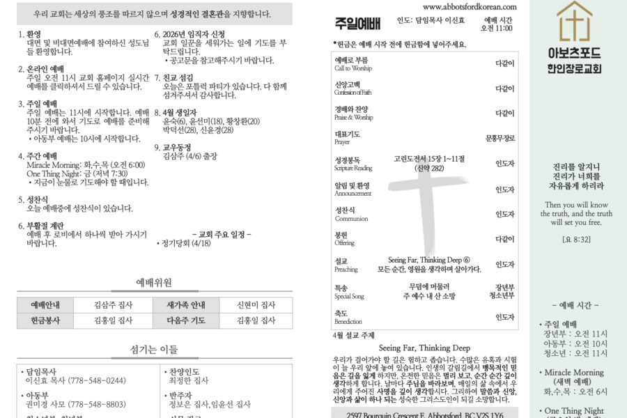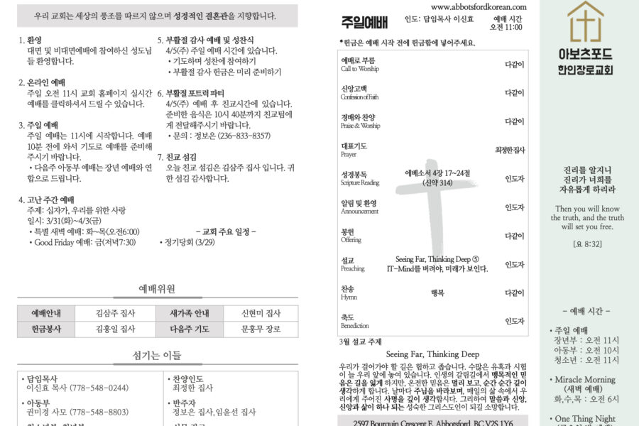 SermonWorship and Praise Seeing Far, Thinking Deep ⑤ It-Mind를 버려야, 미래가 보인다. https://youtu.be/e8U8Kl27jBkshinhyo leeMarch 30, 2026